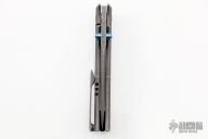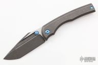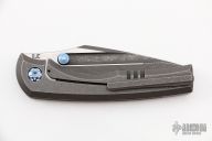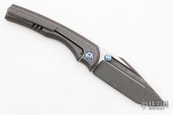 This BBM V2 by Nick Chuprin and Robert Carter features an acid wash tumble finish blade with fullers, dual anodized thumbstuds and milled bevels. The handle has a stonewashed titanium frame, anodized titanium pivot, screws and backspacer and a stonewashed titanium tip up clip with hidden screws. Rides on bearings, nice detent, lockup and blade seating. Comes with a zippered case. New from maker at the 2022 USN Gathering.
