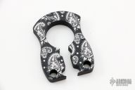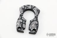 This keeper by John Gray is made from aluminum and has been cerakoted black with white paisley pattern. Has a bottle opener and holes for a key ring. Can be hung from a belt loop. Can also be used as a knuckle. New from maker at the 2022 USN Gathering. This one's pronouns are "He/Him".