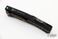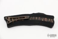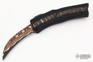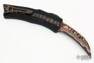 This Custom ROC by Heretic Knives features a hand ground hawkbill Baker Forge Tiger GoMai San Mai Damascus blade with fullers and notched thumbrest. The handle has a black aluminum chasis with Brass/Copper Snakeskin Fat Carbon inlays, tip down bronze titanium clip with ceramic ball. Brass/Copper Snakeskin Fat Carbon inlay in the push button. Comes with original box and COA #059 and dated 8/22. New from maker at the 2022 USN Gathering.