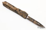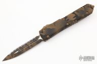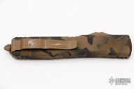 This Ultratech OTF automatic by Microtech features a D/E Coyote Camo blade with one fully serrated edge. Coyote Camo aluminum contoured frame with coyote hardware and tip down stainless steel clip. Dated 08/2022. Includes original box and papers. Excellent condition.