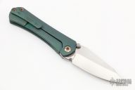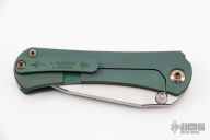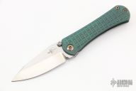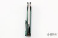 This SBDP by Borka Blades features a two-tone finish blade with mirror polish bevels, satin flats, and dual thumbstuds. The handle has an antique green diamond wash titanium frame with anodized backspacer with tritium insert, anodize finish hardware, and matching tip up clip. Nice detent, lockup and blade seating. Comes with zippered case. New from the 2022 USN Gathering.