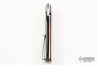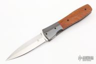 This Model 31 Flipper by Jason Clark features a satin finished blade with a false top edge and a notched flipper tab.  The handle has zirconium bolster, red liners, a single Jamaican wood scale and a titanium lockside.  Titanium tip up pocket clip.  Floating stainless backspacer.  Incudes a leather slip sheath and COA.  New from maker!