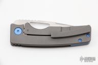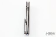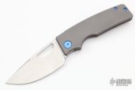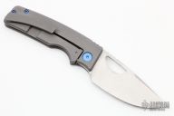 This knife by the OZ Machine Company features a tumbled Magnacut blade with thumbhole and notched thumbrest. The handle features a smooth bead blasted titanium frame with a anodized titanium backspacer and tip up clip with hidden screws. Includes box and papers dated 4-15-22 and s/n 672. Has a light scratch near the clip, otherwise excellent condition.