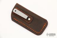 This oil tanned Crazy Horse Water Buffalo leather sheath made by SoulBound Leather and has a stainless steel pocket clip. New from maker at the 2022 USN Gathering. 3.5" tall and 1.5" wide.