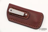 This Brown leather sheath by SoulBound Leather is made from premium full grain English Bridle Leather from Wickett & Craig and has a stainless steel pocket clip. New from maker at the 2022 USN Gathering. 3.5" tall and 1.5" wide.