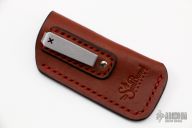 This Brown leather sheath by SoulBound Leather is made from premium full grain English Bridle Leather from Wickett & Craig and has a stainless steel pocket clip. New from maker at the 2022 USN Gathering. 3.5" tall and 1.5" wide.