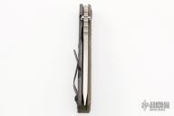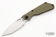 This SNG framelock folder by Mick Strider features a stonewashed tanto blade and a dimple pattern green G-10 and flamed titanium frame and tip up titanium clip. Includes a "Lock Bar Stabilizer" for maximum reverse lock retention. Nice detent, lockup and blade seating. New from maker at the 2022 USN Gathering.