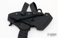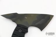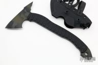 This Bleeding Heart Tomahawk by Half Face Blades features a 2.5" blade with spike at the rear, .219" blade stock, full tang construction. The handle has black G-10 scales. Comes with a kydex sheath. Excellent condition.