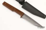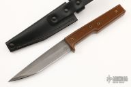 This Scout Knife by Jerome Hovaere features a tanto blade with .137" blade stock and .937" blade depth, hidden tang construction. The handle has checkered brown G-10 scales with a tan G-10 frame and flanged brass tube pins. Comes with a black leather sheath. New from maker at the 2022 USN Gathering.