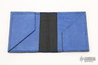 This Bi-fold Wallet by Garza Leather Goods is 100% handmade. The outside is black sharkskin with blue lizard skin pockets. Comes with original box. New from maker at the 2022 USN Gathering.