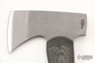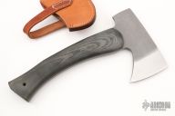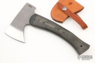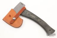 This Camp Axe by David Sharp feature a stonewashed blade and tang with satin finished convex ground blade, .263" blade stock with a full tapered tang. The handle has black linen micarta scales with black canvas micarta pins. Comes with a black leather blade cover. Excellent condition.