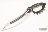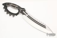 This War Machine from Knife Makers Guild member Todd Begg features a hand rub satin finished blade with a double sawtooth on the spine and carbon fiber inlays, notched thumbrest, .250" blade stock and 2.375" blade depth, full tang construction. The handle has stonewashed titanium scales with carbon fiber inlays. Black titanium D-guard. The tang has Todd's cracked ice finish. Comes with a zippered case. Excellent condition.