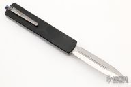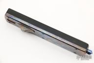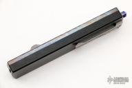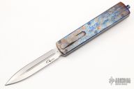 This G12 OTF Auto by Golgoth Knives features a satin finished double edged blade with fullers. The handle has a black aluminum chassis with anodized titanium top, anodized titanium hardware, tip down titanium clip. Comes with velcro case. New from maker at the 2022 USN Gathering. #1748