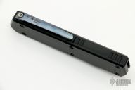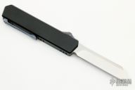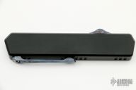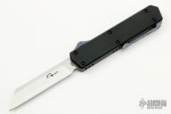 This G13 OTF Auto by Golgoth Knives features a satin finished blade with fullers. The handle has a black aluminum chassis with anodized titanium button and tip down titanium clip. Comes with velcro case. New from maker at the 2022 USN Gathering. #1841