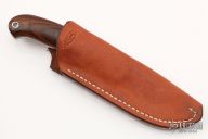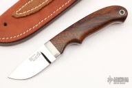 This Loveless Randall Hunter by Jim Merritt features a mirror polished blade with .173" blade stock and .977" blade depth, full tapered tang construction. The handle has a stainless steel guard and lanyard hole at the butt, desert Ironwood scales with red liners. Comes with a brown leather sheath. Excellent condition.