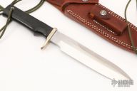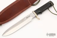 This Model 14 by Randall Made Knives features a satin finished blade with sharpened top edge and notched thumbrest, sawteeth grind without sawteeth, .219" blade stock and 1.384" blade depth, full tang construction. The handle has a nickel silver guard , black linen micarta single finger grip handle. Comes with a brown leather sheath. Excellent condition.