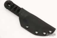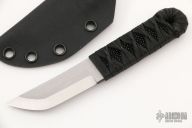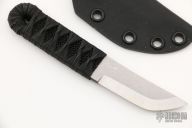 This Small Tanto by Pohan Leu features a satin finished blade with .126" blade thickness and .727" blade depth. Japanese style wrap with black cord over black stingray skin. Comes with Kydex sheath. Excellent condition.