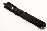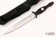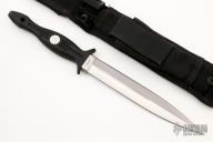 This Shadow IV from Al Mar Knives features a doubled edge dagger style satin finish blade with fullers, .222" blade stock and 1.072" blade depth, hidden tang construction. The handle is comprised of zytel with lanyard hole in pommel. Excellent condition. Comes with black nylon sheath.