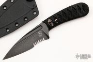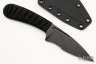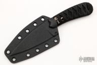 This SIN by Bastinelli Knives features a black recurve blade with notched thumbrest and fullers, .136" blade stock and 1.15" blade depth, full tang construction. The handle has a custom black cord wrap over a bronzed menuki. Comes with kydex sheath and zippered case. New from maker!