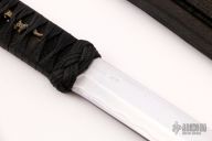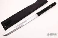 This Tanto from Master Smith Wally Hayes features a tanto blade with a nice hamon and sharpened top edge, .245" blade stock and 1.270" blade depth, hidden tang construction. The handle has stingray skin under a Turk's head paracord bolster and flat black cord wrap with menuki. Comes with a nylon sheath with belt loop. Has some light scratches, otherwise excellent condition.