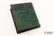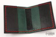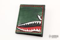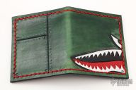 This Bi-fold Wallet by Garza Leather Goods is 100% handmade. The outside has a "WWII Shark" theme with black and green leather inside. New from maker. Comes with original box.