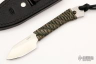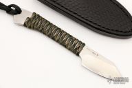 This Skinner by Mickey Yurco features a satin finished blade with .130" blade thickness and .963" blade depth. The handle has cord wrap over full tang. Comes with a hand tooled black leather sheath with clip. New from maker at the 2022 USN Gathering. #4487