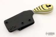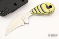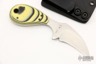 This Claw by Mickey Yurco features a satin finished blade with .127" blade thickness and 1.279" blade depth, full tang construction. The handle has black/yellow G-10 scales. Comes with a kydex sheath. New from maker at the 2022 USN Gathering. #4464
