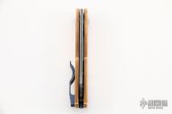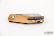 This Monte Carlo by Jens Anso features San Mai Damascus sheepsfoot style blade with nail nick. The handle is comprised of spiral scratch finished mokume scales over dual inlaid liners with double detent that provides a crisp click in the open, closed and half stop positions. Anodized titanium backspacer with lanyard bail and machined tip up clip. Includes leather slip sheath and COA dated November 17th, 2018. Comes with original box. Has one tiny ding in the spine of the handle, otherwise excellent condition.