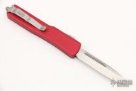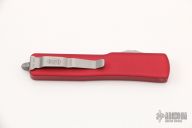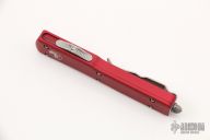 This UTX-70 OTF automatic by Microtech features a S/E satin finish blade with a standard edge. The handle has a red aluminum frame with blasted stainless steel tip down clip. Serial number 9256 and dated 12/2019. Comes with original box and papers. Excellent condition.