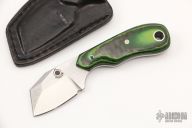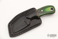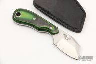 This Wee Razelcliffe from Jonathan Graham features a satin finished blade. Full tang construction with .114" thick 13C26 blade with notched thumbrest, 1" blade depth. The scales are laminated green micarta and carbon fiber fastened using two mosaic pins and lanyard hole. Includes leather sheath. Excellent condition.