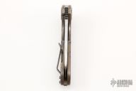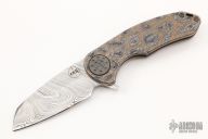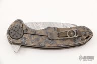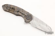 This F3 Medium by Curtiss Knives features a Damasteel blade with notched thumbrest and flipper. The handle has a jigged and anodized titanium frame over notched titanium backspacer, matching titanium tip up clip. Smooth and fast opening using a Caged Bearing System. Has a stainless lockface insert. Nice blade seating, detent and lock up. Includes a zippered case. Excellent condition.