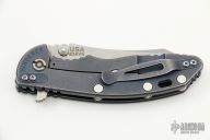 This XM-18 Skinner from Rick Hinderer Knives features a 3.5" blade, notched thumbrest and flipper, dual thumbstuds. The handle has a black/blue G-10 scale, and stonewashed titanium handle, tip up or down pocket clip, fuller tab and standoffs. Clip can be mounted for tip up or down carry. Nice lockup, seating, and detent. The blade has been resharpened, has some scuffs, otherwise good condition.