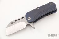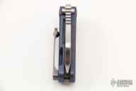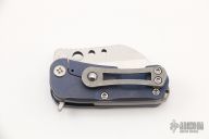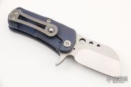 This Chunky Monkey features a stonewashed sheepsfoot blade with a notched thumbrest. The handle has an anodized titanium frame and tip up clip, stainless steel backspacer. Has a couple scuffs, otherwise excellent condition.