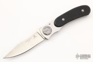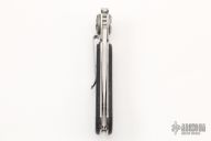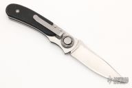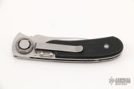 This Paul Prankster has a satin finished 154 CM stainless steel clip point blade with notched thumb rest. Handle is black G-10 over mirror polish stainless steel frame. Stainless steel tip down clip. Has some light scuffs and scratches, otherwise great condition.
