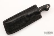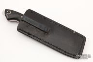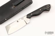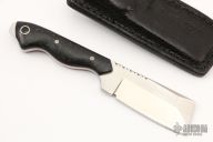 This SS3 Razel fixed blade by Graham Knives features a satin finished blade with two sharpened edges and fileworked thumbrest, .2" blade stock and 1.25" blade depth, full tang construction. The handle is comprised of rag micarta scales with red liners, mosaic pins and lanyard tube. Exposed tang pommel. Includes black leather sheath with clip. Has some light scuffs, excellent condition otherwise.