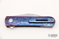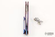 This MBK Slayback by Monterey Bay Knives is a Ray Laconico design, it features a satin finished ZDP-189 San Mai blade with notched flipper. The handle has an anodized titanium frame with stainless steel liner, tip up titanium clip. Comes with zippered case. Excellent condition. Anodizing done by Knife Modders.
