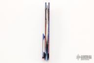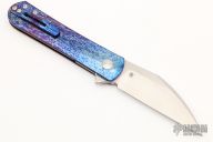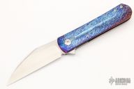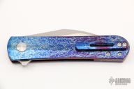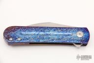 This MBK Slayback XL by Monterey Bay Knives is a Ray Laconico design, it features a satin finished ZDP-189 San Mai blade with notched flipper. The handle has an anodized titanium frame with stainless steel liner, tip up titanium clip. Comes with zippered case. Excellent condition. Anodizing done by Knife Modders.