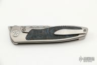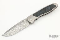 This Mini Tempest from Brian Nadeau features a Damasteel drop point blade with a fuller and notched thumbrest/front flipper. The handle has a bead blasted titanium frame with Blue  Dark Matter FatCarbon inlays, satin titanium tip up clip. Nice detent, lockup and blade seating, stainless lockface insert. Includes original box. Excellent condition.