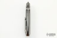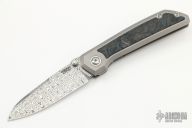 This Mula framelock by Enrique Pena features a Damasteel blade with swedge, notched thumbrest and dual thumbstuds. The handle has a bead blasted titanium frame with blue fat carbon inlays, an anodized titanium backspacer with lanyard pin. Matching tip up titanium clip. Includes original box and papers. Excellent Condition.