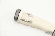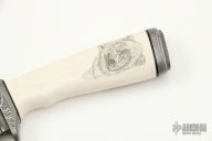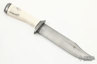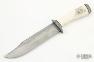 This knife by Gene Martin features a Damascus blade with fileworked spine, .167" blade stock and 1.410" blade depth, hidden tang construction. The handle has a Damascus guard and butt with a scrimshawed mammoth ivory grip. Comes with a maple burl wood presentation box. Has some oxidation on the blade and butt, a crack running the length of the grip, and a little space between the spacers and handle. Good condition otherwise.