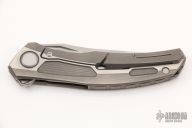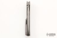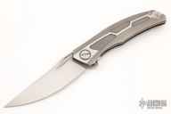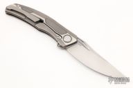 This Quantum Gen2 by Shirogorov features a blasted blade with notched thumbrest and flipper. The handle has a blasted and milled titanium frame, backspacer, tip up titanium clip with hidden screws. Rides on MRBS, nice detent, lockup and blade seating. Comes with original box and COA. Excellent condition.