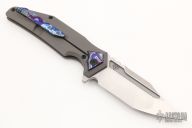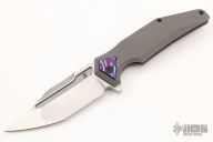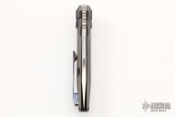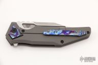 This Abyss by Arcane Design features a satin finished blade with notched thumbrest and flipper. The handle has a bead blasted titanium frame with zircuti pivot collars and tip up clip with hidden screws. Comes with original zippered case, COA and clip/collars. Has a few light scuffs, otherwise excellent condition.