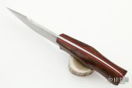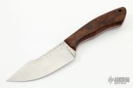 This Hunter by Chris Linton of Osprey Knife and Tool features a two tone blade with satin grinds and hammer marked flats, .152" blade stock and 1.404" blade depth, full tapered tang construction. The handle has ironwood scales with red G-10 and brown canvas micarta liners. Excellent Condition.