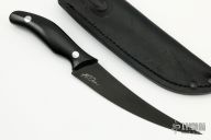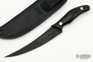 This Midtech Fillet Knife by Ken Onion Knifeworks features a "Dark Matter" finished BD1N blade with .099" blade stock and 1.135" blade depth, mortise tang construction with black G-10 grip. Comes with a black leather sheath. Excellent condition.