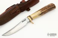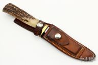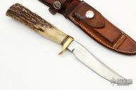 This Model 7-4 by Randall Made Knives features a satin finished blade with false top edge, .170" blade stock and .884" blade depth, hidden tang construction. The handle has a brass guard, stag grip and red/white/blue spacers. Knife comes with a brown leather sheath with belt loop. Has some light scratches and patina, has been sharpened, otherwise good condition. The blade is etched "A. Narushka"