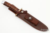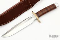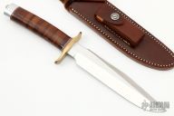 This Model 1-7 from Randall Made Knives features a satin finished clip point blade with sharpened top edge, .204" blade stock and 1.295" blade depth, hidden tang construction. The handle is comprised of a brass guard, red/white/blue spacers, stacked leather handle and duralumin pommel. Comes with brown leather sheath. Has some light scratches, otherwise excellent condition.