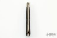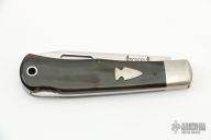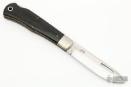 This Slipjoint from Scagel Knives features a satin finished blade with thumbhole. The handle has nickel silver bolsters and escutcheon, black horn scales, brass liners and stainless steel backspacer. Has been resharpened, has some scratches, otherwise good condition.