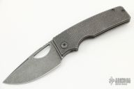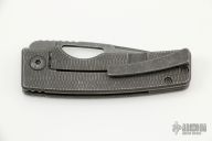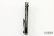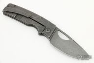 This knife by the OZ Machine Company features a stonewashed Z-FiNiT blade with a false top edge, thumbhole and notched thumbrest.  The handle features a "Golf Putter" milled and stonewashed titanium frame with a titanium tip up pocket clip and backspacer.  Includes box and COA dated 12-30-21. New condition.