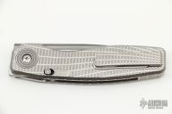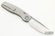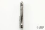This FSD by Craig Brown Knives features a drop point stonewashed polish blade and notched flipper and fullers. The handle has a tumbled titanium frame with milling style #1, titanium tip up clip and backspacer. Nice detent, action, blade seating and lock up. Comes with original hard case with certificate #225. Excellent condition.