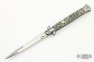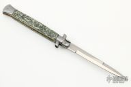 This 11" Picklock by Frank Beltrame features a polished blade with false top edge. The handle has stainless steel bolsters, front and rear, money micarta scales, miniature Buffalo Nickel for a push button, fileworked brass liners, stainless spring. Has some scratches, otherwise excellent condition.